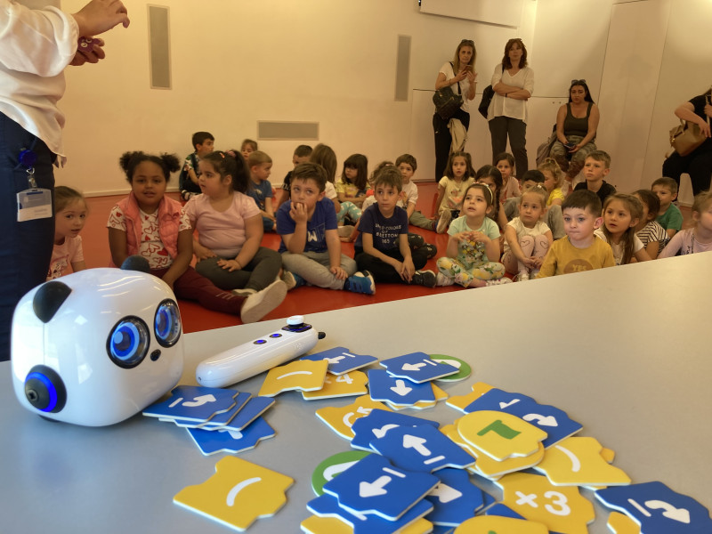 Οι μικροί μας φίλοι ξεναγήθηκαν στο παιδικό τμήμα και γνώρισαν τη παιδική συλλογή βιβλίων και παιχνιδιών. Έμαθαν για το πώς μπορούν να γίνουν μέλη μιας Βιβλιοθήκης και μοιράστηκαν μαζί μας τα αγαπημένα τους παιδικά βιβλία. Έπειτα, χωρίστηκαν σε ομάδες και ασχολήθηκαν με το εκπαιδευτικό πακέτο ρομποτικής mTiny, πραγματοποιώντας μια πρώτη εισαγωγή στον κόσμο του προγραμματισμού. Εξέφρασαν τις ιδέες τους για το τι είναι η ρομποτική και τι μπορούμε να κάνουμε με την κατασκευή ρομπότ. Στη συνέχεια, έπαιξαν με το μικρό πάντα-ρομποτάκι, που τους ενθουσίασε με τις δυνατότητές του, σχεδίασαν διαδρομές με τις κάρτες προγραμματισμού και διασκέδασαν με τους διαδραστικούς χάρτες!