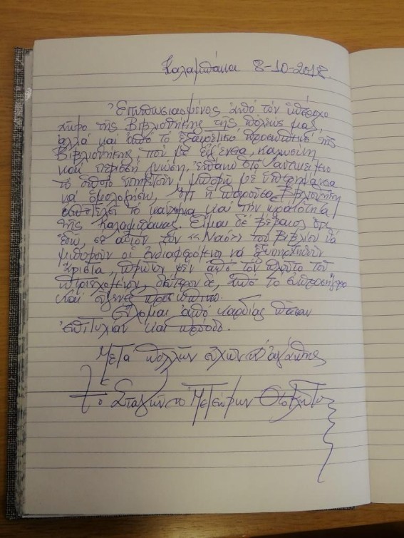 Δεν έκρυψε τον ενθουσιασμό του με το πλήρως τεχνολογικά εξοπλισμένο και γεμάτο χρώμα παιδικό τμήμα και έδειξε ιδιαίτερο ενδιαφέρον για το σύστημα οργάνωσης της έντυπης συλλογής της Βιβλιοθήκης.