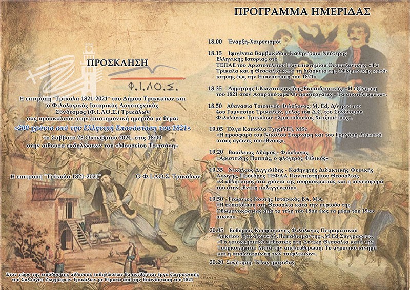 Επιστημονική Ημερίδα: «1821-2021-Διακόσια Χρόνια από την Ελληνική Επανάσταση», θα πραγματοποιηθεί το Σάββατο 23 Οκτωβρίου 2021, ώρα 6:00 μ.μ., στην Αίθουσα εκδηλώσεων του Μουσείου Τσιτσάνη στα Τρίκαλα.