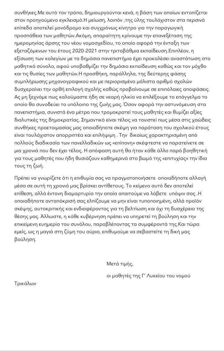 Ακολουθεί επιστολή των μαθητών της Γ’ Λυκείου του Ν. Τρικάλων που υπογράφουν και οι μαθητές του Δήμου Μετεώρων, στην υπουργό Παιδείας εκφράζοντας την δυσαρέσκεια τους για το νέο νομοσχέδιο του Υπουργείου που πρόκειται να τεθεί σε εφαρμογή.