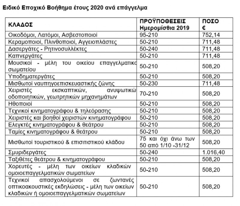 - Δικαιούχοι είναι εργαζόμενοι ασφαλισμένοι στον Ηλεκτρονικό Εθνικό Φορέα Κοινωνικής Ασφάλισης (e-ΕΦΚΑ) που ασκούν ένα από τα παρακάτω επαγγέλματα: οικοδόμου, λατόμου, ασβεστοποιού, κεραμοποιού, πλινθοποιού, αγγειοπλάστη, δασεργάτη, ρητινοσυλλέκτη, καπνεργάτη, μουσικού-μέλους του οικείου επαγγελματικού σωματείου, υποδηματεργάτη, μισθωτού ναυπηγοεπισκευαστικής ζώνης, χειριστή εκσκαπτικών, ανυψωτικών, οδοποιητικών, γεωτρητικών μηχανημάτων, ηθοποιού, τεχνικού κινηματογράφου και τηλεόρασης χειριστή και βοηθού χειριστή κινηματογράφου, ελεγκτή κινηματογράφου και θεάτρου, ταμία κινηματογράφου και θεάτρου, μισθωτού τουριστικού και επισιτιστικού κλάδου, σμυριδεργάτη, το επάγγελμα του ταξιθέτου θεάτρου-κινηματογράφου, του χορευτή-μέλους των οικείων κλαδικών ή ομοιοεπαγγελματικών σωματείων, καθώς και του τεχνικού απασχολούμενου σε ζωντανές οπτικοακουστικές εκδηλώσεις-μέλους των οικείων κλαδικών ή ομοιοεπαγγελματικών σωματείων.