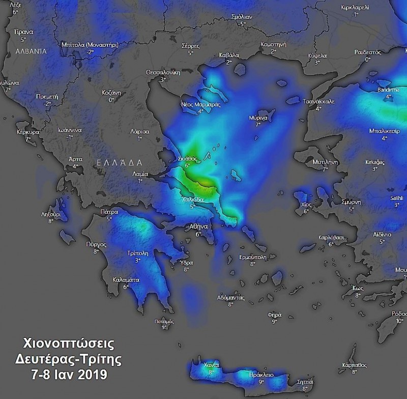 Τη Δευτέρα, χιονοπτώσεις από τις πρωινές ώρες αναμένονται στην Ανατολική Μακεδονία και στη Χαλκιδική που γρήγορα θα επεκταθούν στις Σποράδες, στην Ανατολική Θεσσαλία, στην Ανατολική Στερεά (και στην Αττική), στην Εύβοια, στη Βόρεια και Ανατολική Πελοπόννησο, καθώς, και στα ορεινά της Κρήτης. Βροχές ή χιονόνερο θα σημειωθούν στο Αιγαίο και στη Δυτική Ελλάδα.