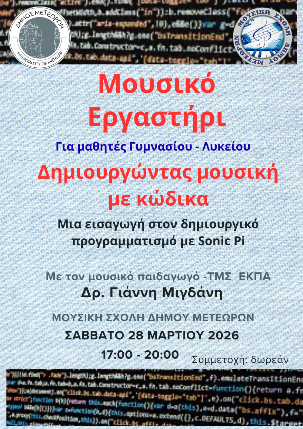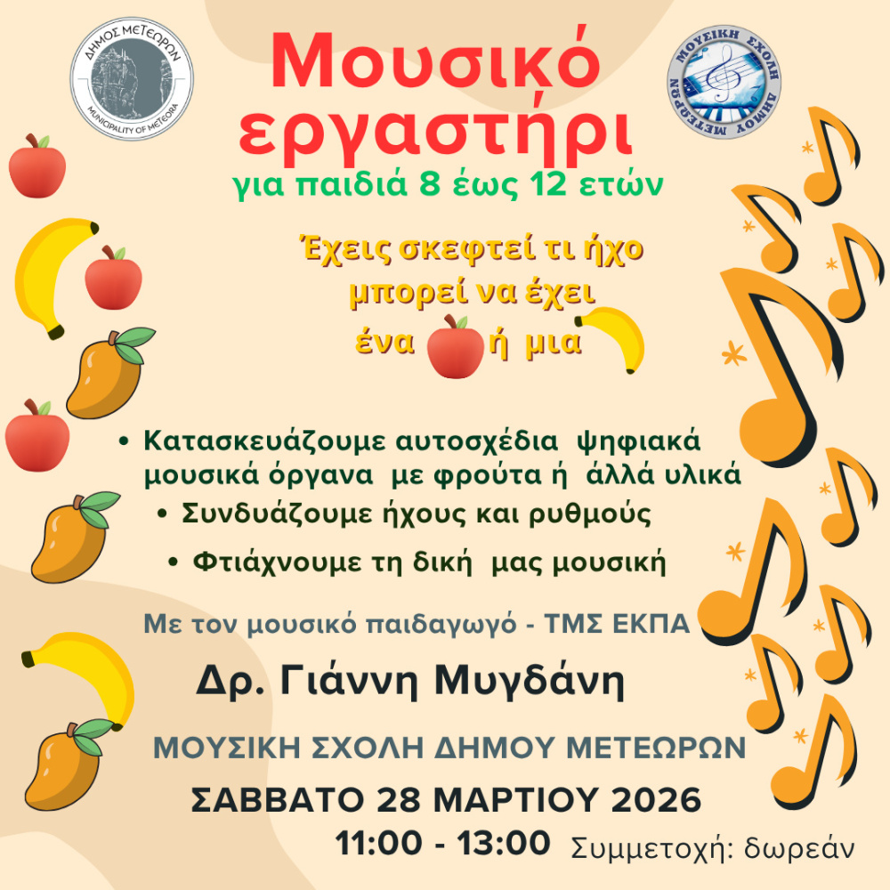 Ο Δήμος Μετεώρων και η Μουσική Σχολή διοργανώνουν εργαστήρια μουσικής και δημιουργικής αξιοποίησης της τεχνολογίας με τον Καλαμπακιώτη μουσικό παιδαγωγό – ΤΜΣ ΕΚΠΑ ,