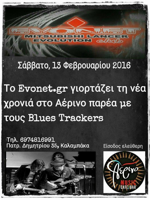Τα μέλη του evonet.gr που είναι ιδιοκτήτες με οχήματα Mitsubishi EVO θα βρεθούν στην περιοχή μας και θα πραγματοποιήσουν μια σειρά από δραστηρίοτητες όπως κοπή πίτας, βόλτες στην περιοχή και το Σάββατο το βράδυ διασκέδαση με τους Blues Truckers στο ΑΕΡΙΝΟ και η είσοδος είναι ελεύθερη για όλους!!!