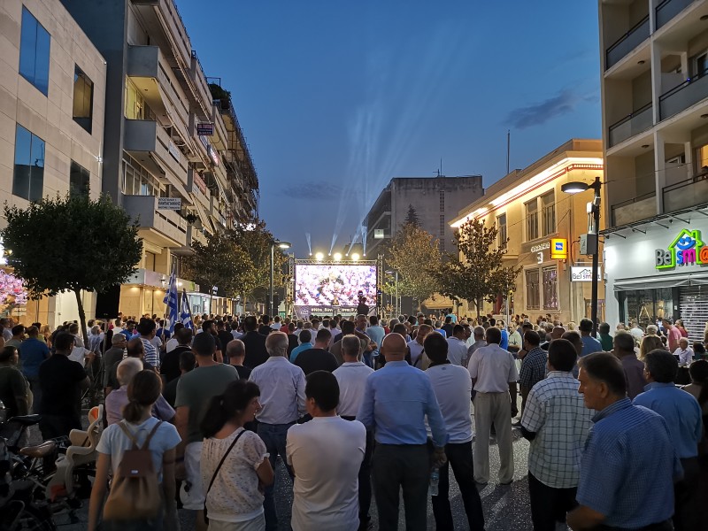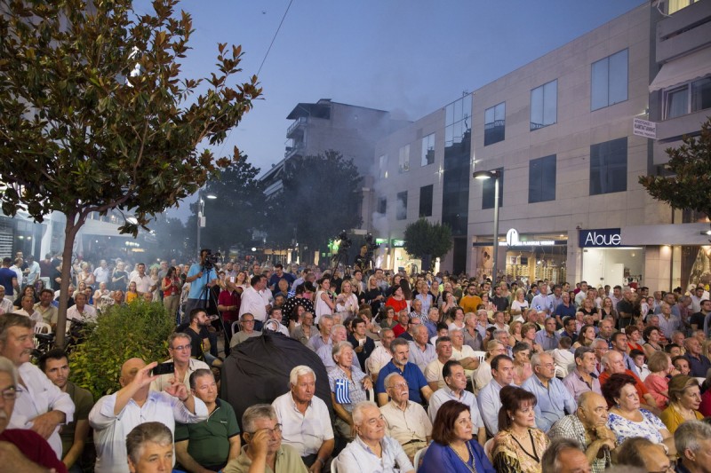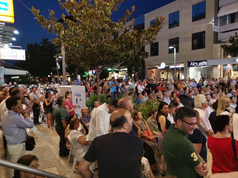 Πράγματι, ο πεζόδρομος της Ασκληπιού αποδείχθηκε πολύ στενός για να χωρέσει τους χιλιάδες συμπολίτες μας που με σημαίες, συνθήματα και… καπνογόνα δημιούργησαν προεκλογικό κλίμα άλλων εποχών.