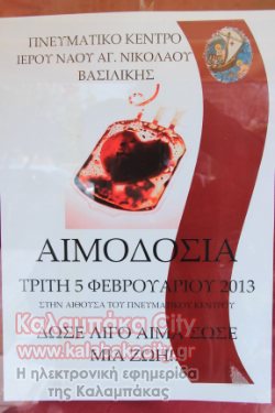 Η αιμοδοσία θα γίνει στον χώρο του Πνευματικού Κέντρου του Ιερού Ναού Αγίου Νικολάου Βασιλικής από την κινητή μονάδα αιμοδοσίας του Νοσοκομείου Τρικάλων.