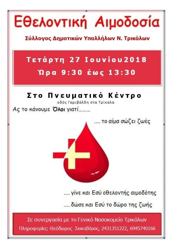 Ο Σύλλογος Δημοτικών Υπαλλήλων Ν. Τρικάλων διοργανώνει εθελοντική αιμοδοσία την Τετάρτη 27 Ιουνίου 2018 από 09:30 έως 13:30 στο Πνευματικό Κέντρο του Δήμου. Η σημαντική αυτή πρωτοβουλία πραγματοποιείται σε συνεργασία με το Γενικό Νοσοκομείο Τρικάλων.