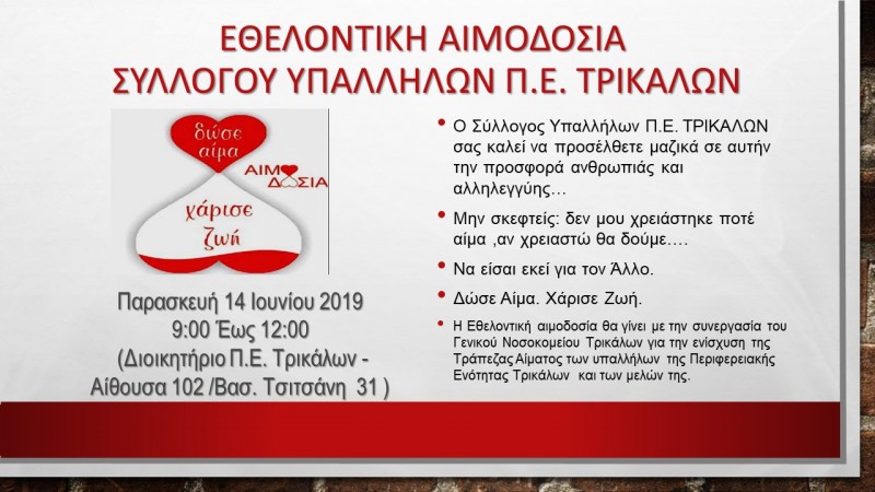Ο Σύλλογος Υπαλλήλων Περιφερειακής Ενότητας Τρικάλων (Σ.Υ.Π.Ε.Τ.), με αφορμή την Παγκόσμια ημέρα εθελοντή αιμοδότη, καλεί την Παρασκευή 14 Ιουνίου 2019 και ώρες 09:00-12:00, στην αίθουσα 102 του κτιρίου της Περιφερειακής Ενότητας Τρικάλων , στην προγραμματισμένη από το Σύλλογο, ΕΘΕΛΟΝΤΙΚΗ ΑΙΜΟΔΟΣΙΑ για την Τράπεζα Αίματός των υπαλλήλων της Περιφερειακής Ενότητας Τρικάλων και των μελών της.