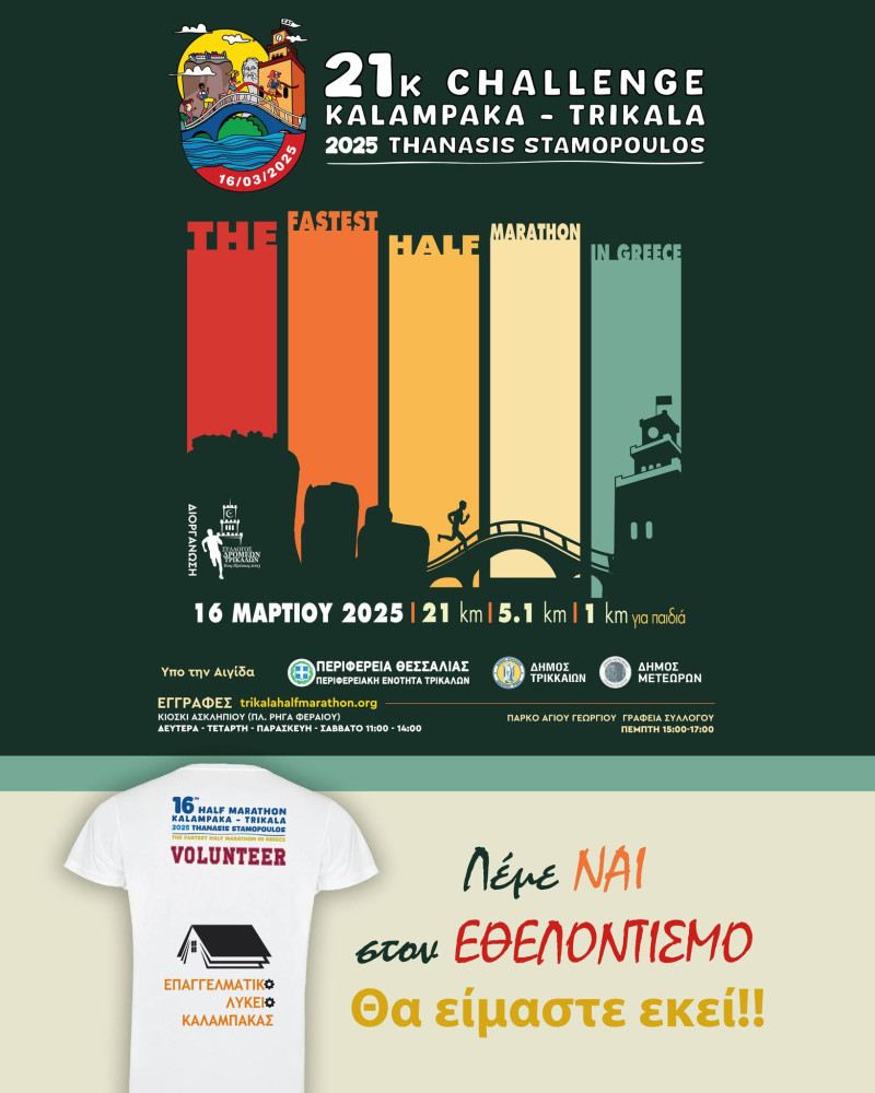 Ο Ημιμαραθώνιος ‘Καλαμπάκα – Τρίκαλα’, ο πιο γρήγορος στην Ελλάδα, ξεκινάει την Κυριακή 16 Μαρτίου στις 10:00 π.μ με αφετηρία την πόλη της Καλαμπάκας και οι δρομείς τερματίζουν στα Τρίκαλα!