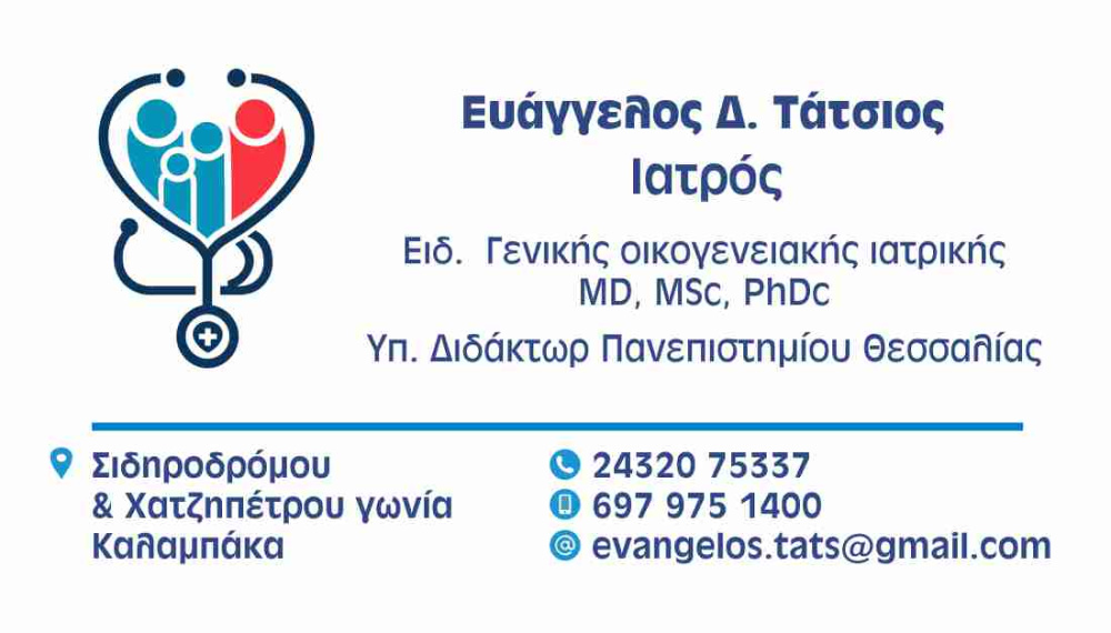 Ο Καλαμπακιώτης ιατρός Ευάγγελος Δ. Τάτσιος, ειδικός στη Γενική / Οικογενειακή Ιατρική (MD, MSc, PhDc – Υπ. Διδάκτωρ Πανεπιστημίου Θεσσαλίας), ξεκίνησε τη λειτουργία του νέου του ιατρείου στην Καλαμπάκα, Σιδηροδρόμου & Χατζηπέτρου γωνία.