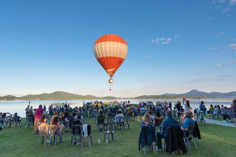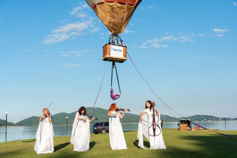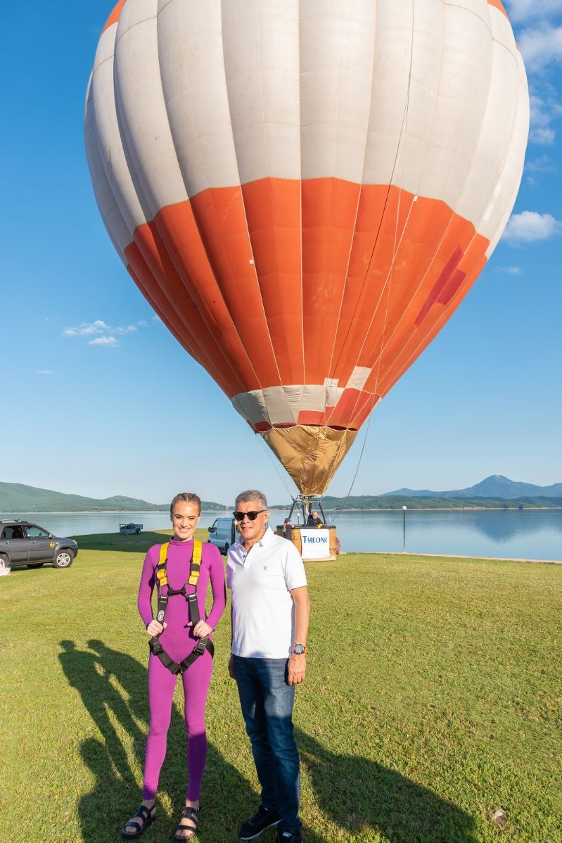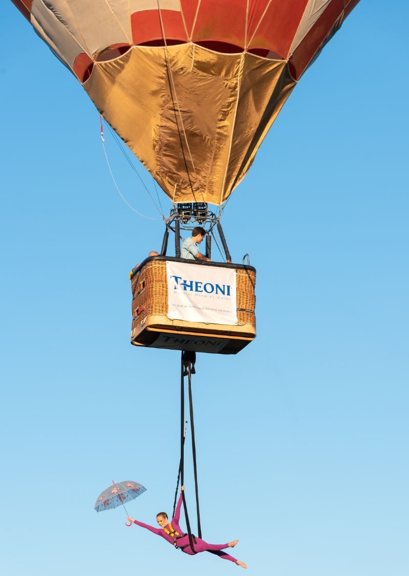 Η Aerial Dance Performer Dr Λίλα Ζαφειρούδη αιωρούμενη από ένα αερόστατο, παρουσίασε εναέριο χορό με τα πολύχρωμα πανιά της στο μοναδικής ομορφιάς τοπίο πάνω από τη Λίμνη.