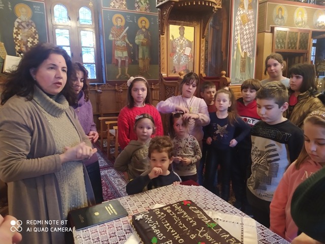 Στην κοπή πίτας συμμετείχαν η πρεσβυτέρα κα. Ελένη Οικονόμου (υπεύθυνη για το Κατηχητικό του Δημοτικού), η αγιογράφος κα. Μαίρη Κουβάτα (υπεύθυνη για το Καλλιτεχνικό εργαστήρι) και η MSc Βιβλιοθηκονόμος κα. Έφη Δούλη (υπεύθυνη για την Πολυζώειο ενοριακή βιβλιοθήκη). Πλήθος παιδιών κατέκλυσαν τον Ιερό Ναό μαζί με τους γονείς τους και έζησαν όμορφες ενοριακές στιγμές!