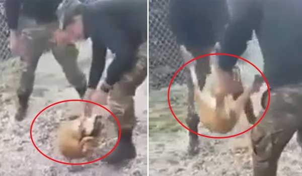 Το βίντεο έχει καταγράψει τη στιγμή που δύο φαντάροι του ελληνικού στρατού ακινητοποιούν ένα αδέσποτο σκύλο και στη συνέχεια τον εκσφενδονίζουν σε γκρεμό ενώ γελάνε.