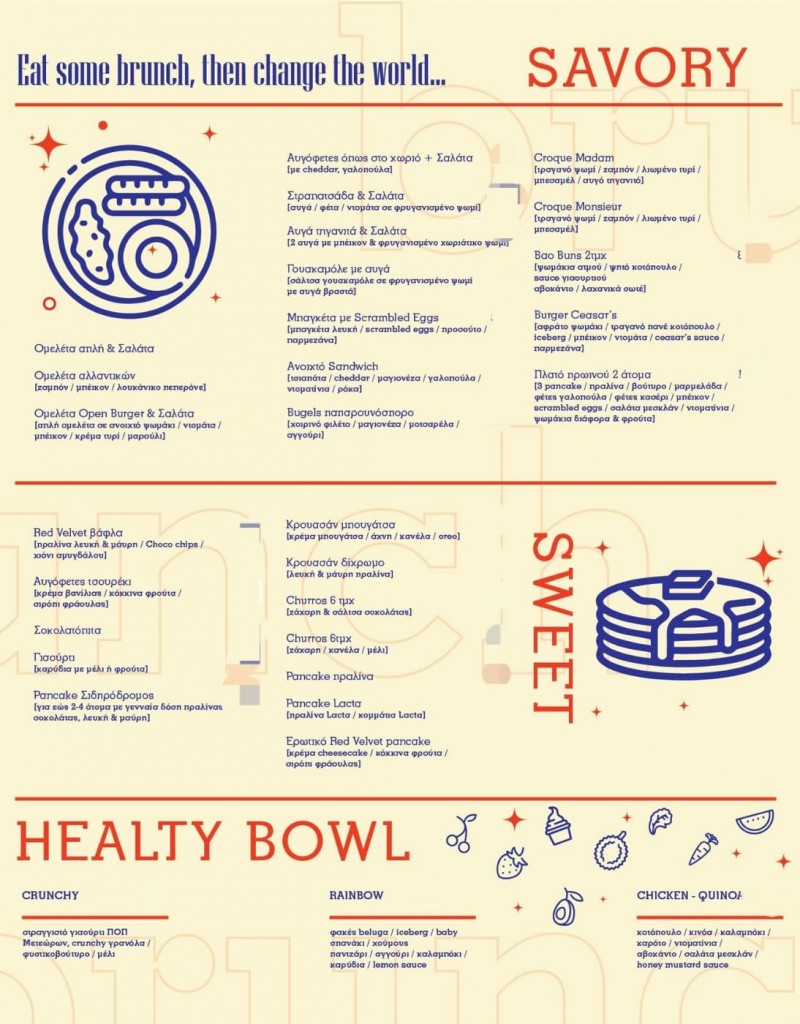 Δοκιμάστε τα νέα μας χορταστικά HEALTHY BOWL τα αφράτα BAO BUNS , τα διάσημα ζαχαρωμένα CHURROS με κανέλα ή ζεστή σάλτσα σοκολάτας που λατρεύουν μικροί και μεγάλοι , το φημισμένο μας pancakes σιδηρόδρομος , είναι μόνο μερικές από τις λέξεις-κλειδιά που θα συνοδεύσουν άρτια τον καφέ, τον χυμό ή το τσάι της επιλογής σας.