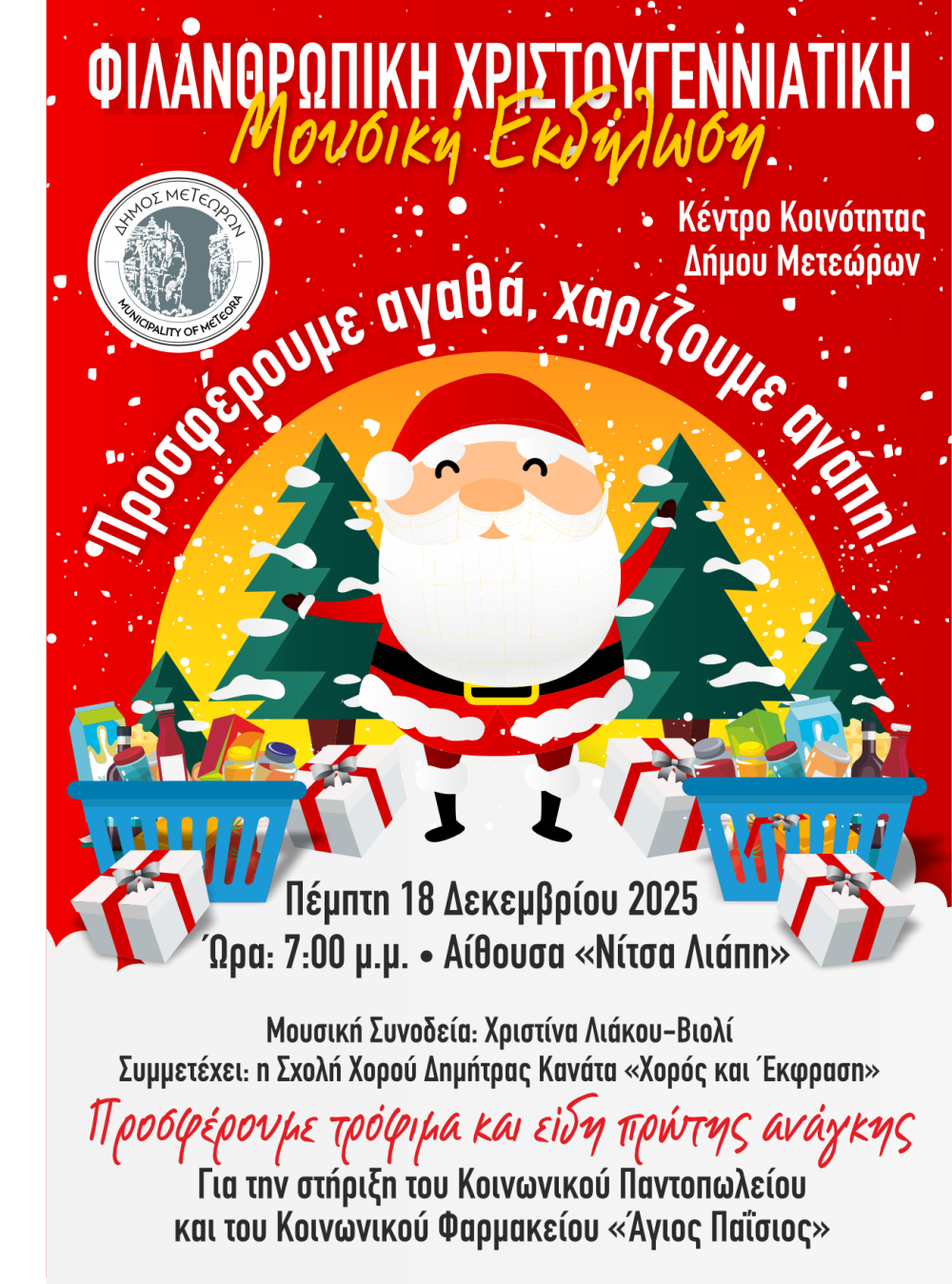 Στο πλαίσιο της εκδήλωσης, προσφέρουμε τρόφιμα και είδη πρώτης ανάγκης, τα οποία θα διατεθούν για τη στήριξη του Κοινωνικού Παντοπωλείου και του Κοινωνικού Φαρμακείου «Άγιος Παΐσιος». Ο Δήμος Μετεώρων καλεί όλους τους πολίτες να συμμετάσχουν ενεργά, αποδεικνύοντας έμπρακτα ότι το μήνυμα των Χριστουγέννων είναι η προσφορά και η αλληλεγγύη προς τον συνάνθρωπο.