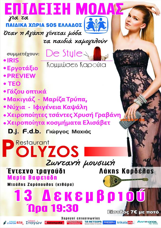 Η θεάρεστη πράξη… συνεχίζεται και φέτος και το Σάββατο 13 Δεκεμβρίου το βράδυ στις 19:30 στην αίθουσα εκδηλώσεων της καταστήματος “POLYZOS” θα πραγματοποιηθεί Φιλανθρωπική επίδειξη μόδας με την συμμετοχή αρκετών καταστημάτων της πόλης μας.