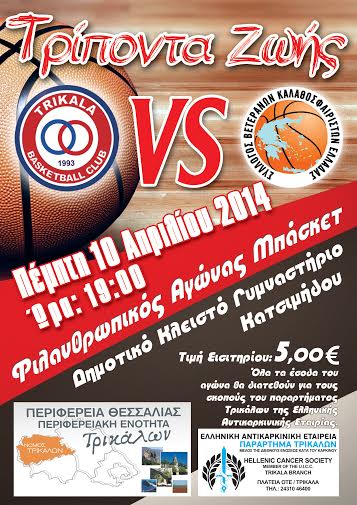 Δείχνοντας για άλλη μια φορά το κοινωνικό της πρόσωπο αποδεικνύοντας ότι όλοι μαζί μπορούμε και πρέπει να προσφέρουμε στον συνάνθρωπό μας και με σύνθημα «Τρίποντα Ζωής», η Περιφέρεια Θεσσαλίας Περιφερειακή Ενότητα Τρικάλων σε συνεργασία με τον Αίολο Τρικάλων και την Ελληνική Αντικαρκινική Εταιρεία παράρτημα Τρικάλων , διοργανώνουν φιλανθρωπικό αγώνα μπάσκετ ανάμεσα στα Τρίκαλα B.C. και την ομάδα Ελλήνων Βετεράνων Καλαθοσφαιριστών.