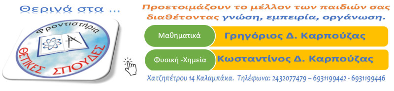- Οι καθηγητές του φροντιστηρίου Θετικές Σπουδές θέλοντας να συμβάλλουν στην καλύτερη προετοιμασία των μαθητών του Γυμνασίου εν’ όψη των προαγωγικών τους εξετάσεων που ξεκινούν τη Δευτέρα 3 Ιουνίου, προσφέρουν σε όλους τους μαθητές, δωρεάν τεστ ερωτήσεων Σωστού Λάθους .