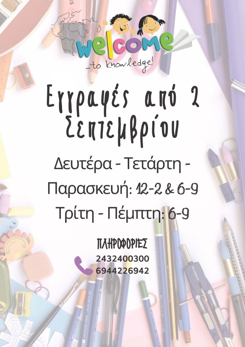 Φροντιστήριο Αγγλικών Welcome to Knowledge – Έναρξη Εγγραφών Ανακοινώσεις Από admin Δημοσίευση Αυγ 28, 2019 -16:20 0 519 Κοινοποίηση FacebookTwitterΗλεκτρονικό ΤαχυδρομείοViber Από το Φροντιστήριο Αγγλικών Welcome to Knowledge στην Καλαμπάκα ανακοινώνεται: Έναρξη Εγγραφών από 2 Σεπτεμβρίου Δευτέρα – Τετάρτη – Παρασκευή: 12:00 μ.μ. έως 2 μ.μ. και 6:00 μ.μ. έως 09:00 μ.μ. Τρίτης – Πέμπτη: 6:00 μ.μ. έως 9:00 μ.μ. 0 519 Κοινοποίηση