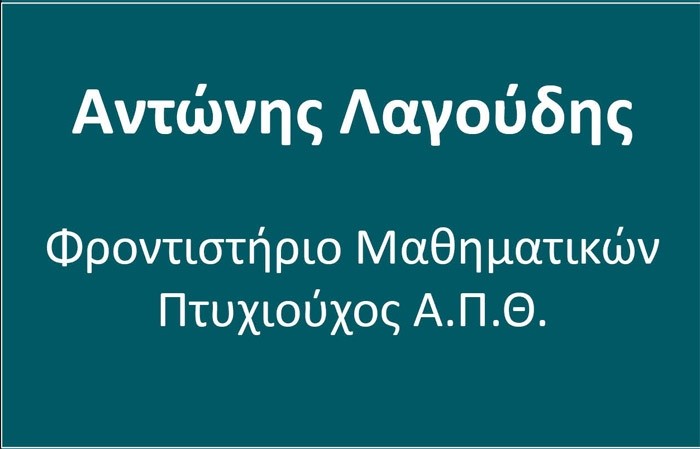 Από το Φροντιστήριο Μαθηματικών Αντώνης Λαγούδης ανακοινώνεται πως οι εγγραφές των μαθητών ξεκίνησαν και γίνονται καθημερινά από 11:00 π.μ. έως 1:00 μ.μ και 5:00 μ.μ. έως 8:00 μ.μ.
