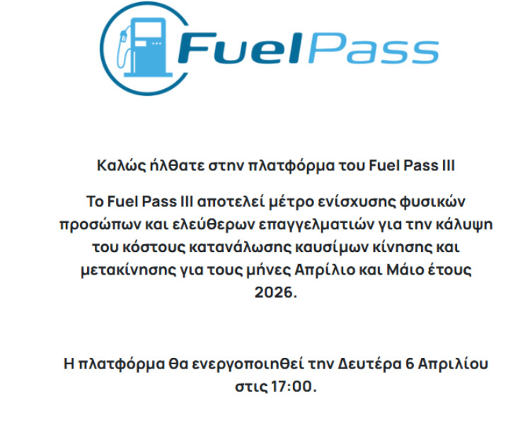 Από σήμερα, Μεγάλη Δευτέρα στις 17:00 το απόγευμα, τίθεται σε λειτουργία η ειδική πλατφόρμα για το Fuel Pass 2026, με στόχο την ανακούφιση των νοικοκυριών από το αυξημένο κόστος κίνησης και θέρμανσης.