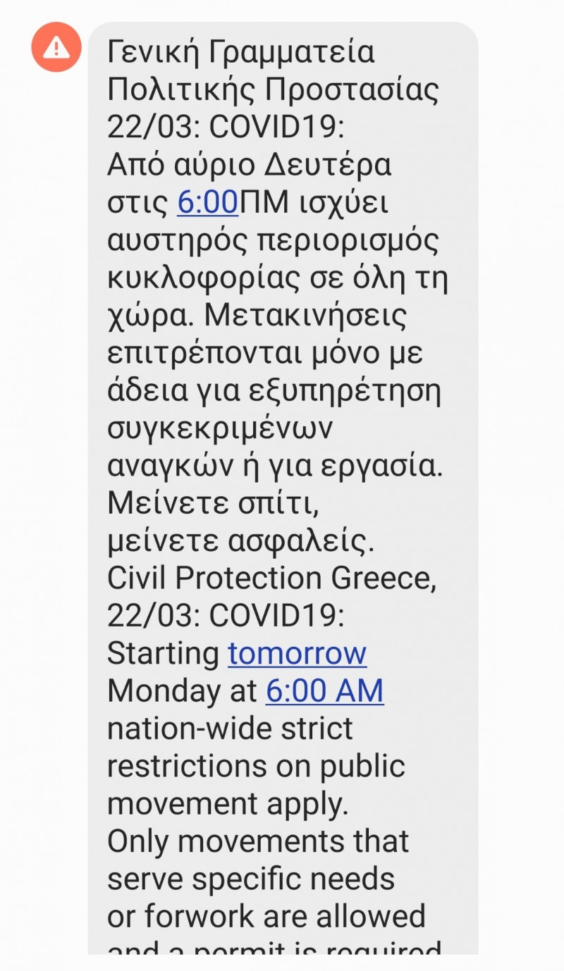 Μήνυμα στα κινητά για τον Περιορισμό Κυκλοφορίας εστάλη από την Γραμματεία Πολιτικής Προστασίας αναφέροντας τα εξής: