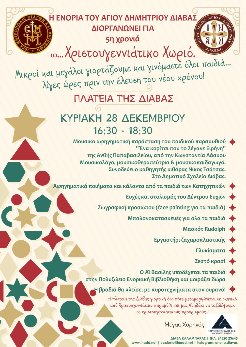 Η Ενορία του Αγίου Δημητρίου Διάβας διοργανώνει για 5η χρονιά το Χριστουγεννιάτικο χωριό.