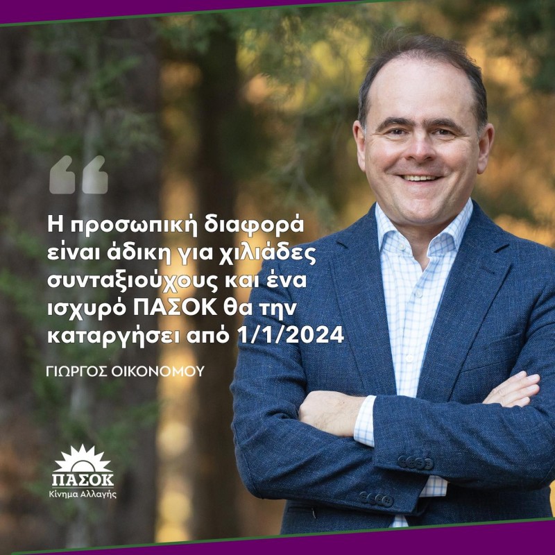 Η προσωπική διαφορά του νόμου Κατρούγκαλου είναι άδικη για δεκάδες χιλιάδες συνταξιούχους. Με ένα ισχυρό ΠΑΣΟΚ η προσωπική διαφορά καταργείται από 1/1/2024 και μέχρι τότε θα δοθεί εφάπαξ ποσό που θα καλύψει την απώλεια εισοδήματος με βάση τον πληθωρισμό του 2022.