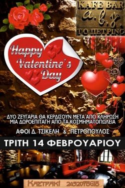 Όπως κάθε χρόνο έτσι και φέτος το καφέ – μπαρ ΑΒΓ Το Πέτρινο στο Καστράκι γιορτάζει μαζί σας τη γιορτή των ερωτευμένων και προσφέρει δύο δωροεπιταγές από τα κοσμηματοπωλεία της πόλης μας Αφοί Δ. Τσικέλη και Πετρόπουλος σε δύο τυχερά ζευγάρια που θα αναδειχθούν μετά από κλήρωση.