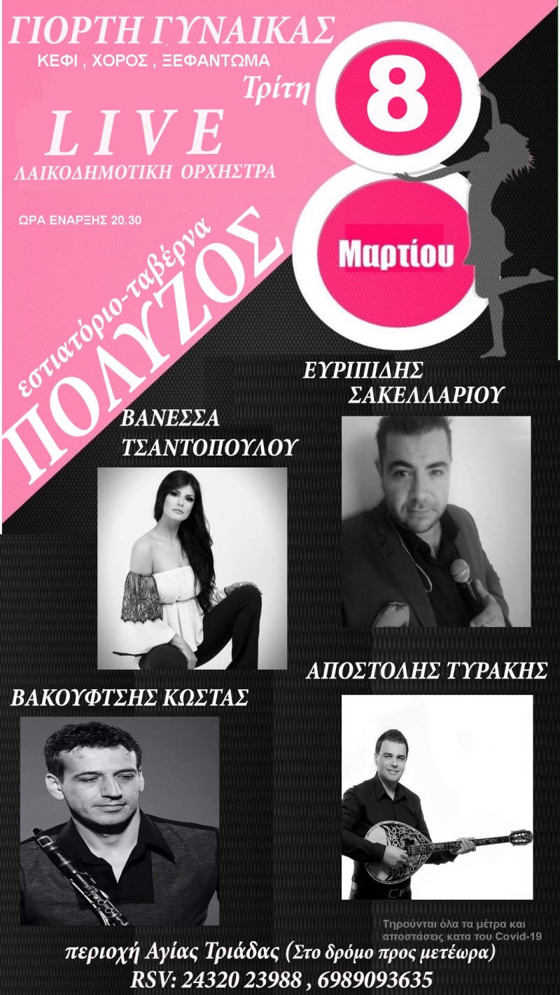 Για την ιδιαίτερη αυτή ημέρα Τρίτη 8 ΜΑΡΤΙΟΥ το εστιατόριο “ΠΟΛΥΖΟΣ” προσκαλεί όλες τις γυναίκες να διασκεδάσουν με ζωντανή μουσική και να απολαύσουν νόστιμο φαγητό και άφθονο ποτό σε προσιτές τιμές με πλήρες μενού!