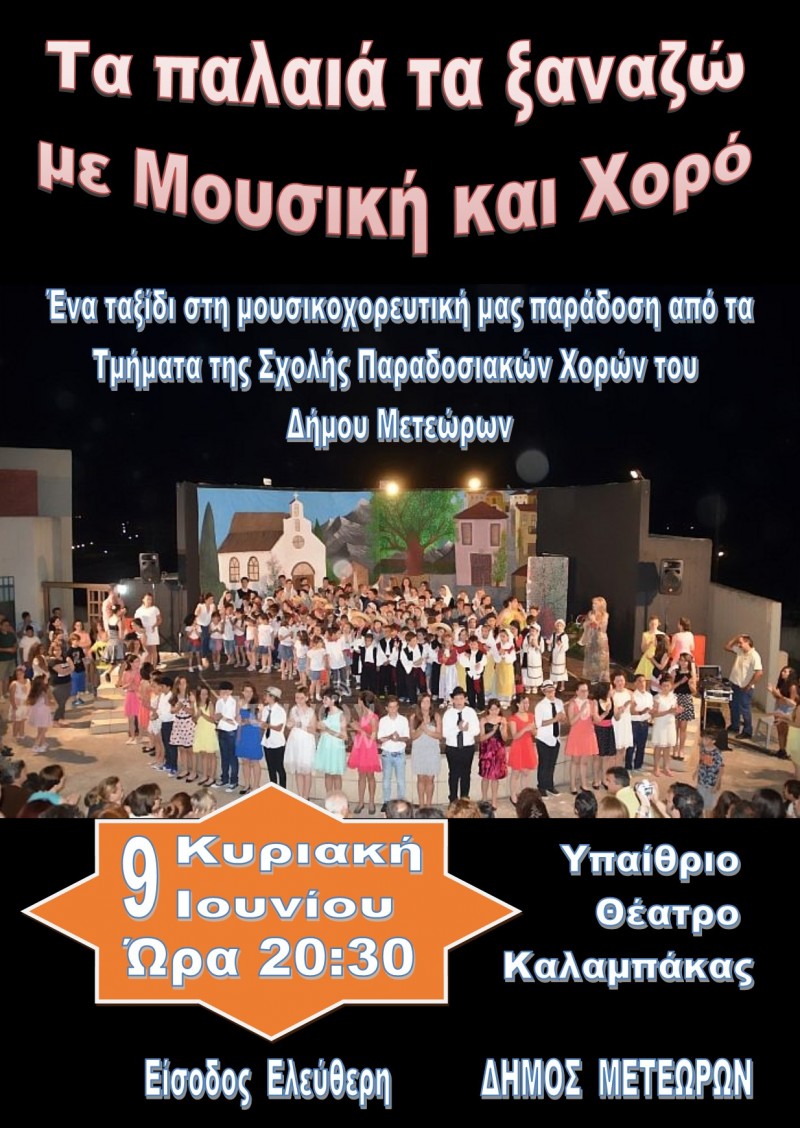 Τα χορευτικά τμήματα της Σχολής Παραδοσιακών Χορών του Δήμου Μετεώρων θα ταξιδέψουν στην μουσικοχορευτική μας παράδοση, ξαναζώντας τα παλιά, ώστε να πάρουμε τα εφόδια προκειμένου να συνεχίσουμε αυτό το αέναο ταξίδι στο χρόνο που ο Έλληνας έχει στιγματίσει με τρόπο μοναδικό.