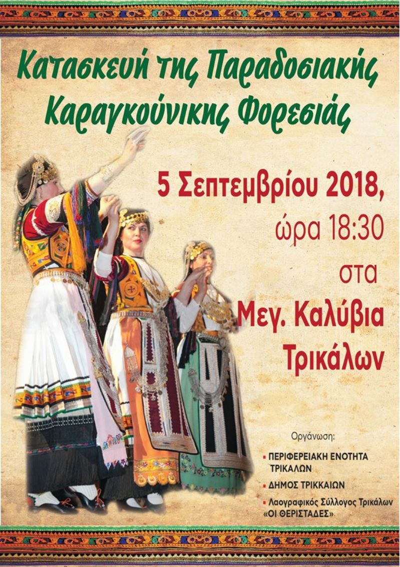 Μια μοναδική ευκαιρία θα έχουν οι Τρικαλινοί την ερχόμενη Τετάρτη. Στις 5 Σεπτεμβρίου στις 6:30 το απόγευμα, στην πρωτεύουσα των Καραγκούνικων χωριών των Τρικάλων, τα Μεγάλα Καλύβια θα πραγματοποιηθεί εκδήλωση με θέμα την κατασκευή της Παραδοσιακής Καραγκούνικης Φορεσιάς.