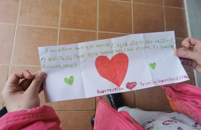 Η 11χρονη Κωνσταντίνα, από το 9ο Δημοτικό Σχολείο Τρικάλων, δεν το σκέφτηκε πολύ, όταν είδε στις ειδήσεις ένα γράμμα που έστειλαν παιδιά όμοιας ηλικίας από τη γειτονική Ιταλία, σε άλλα παιδιά, στην Ουκρανία: κάθησε και έγραψε το δικό της γράμμα, στα ελληνικά. Το πρόβλημα τη γλώσσας παρέμενε, αλλά της αγάπης η θέληση το έλυσε: η τεχνολογία επιστρατεύτηκε και το γράμμα, στην ουκρανική γλώσσα, ντύθηκε με καρδούλες και ζωγραφιές. Παραδόθηκε την Παρασκευή 18 Μαρτίου 2022 στο αντιδήμαρχο Κοινωνικής Μέριμνας του Δήμου Τρικκαίων, Νίκο Σακκά, μαζί με τα τρόφιμα που προσκόμισε η Κωνσταντίνα και ο πατέρας της. Ο Δήμος, εξάλλου, συγκέντρωσε εκ μέρους των τρικαλινών, μια εξαιρετικά μεγάλη ποσότητα ειδών πρώτης ανάγκης για τον ουκρανικό λαό.