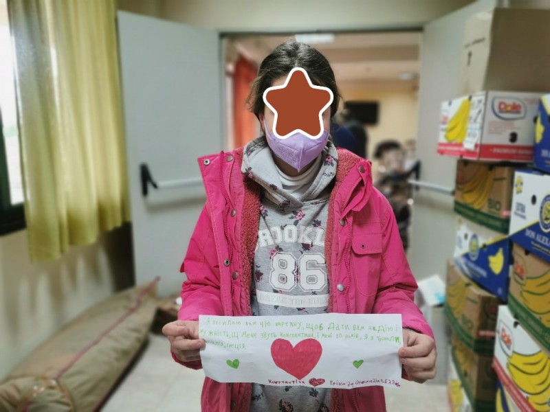 Η 11χρονη Κωνσταντίνα, από το 9ο Δημοτικό Σχολείο Τρικάλων, δεν το σκέφτηκε πολύ, όταν είδε στις ειδήσεις ένα γράμμα που έστειλαν παιδιά όμοιας ηλικίας από τη γειτονική Ιταλία, σε άλλα παιδιά, στην Ουκρανία: κάθησε και έγραψε το δικό της γράμμα, στα ελληνικά. Το πρόβλημα τη γλώσσας παρέμενε, αλλά της αγάπης η θέληση το έλυσε: η τεχνολογία επιστρατεύτηκε και το γράμμα, στην ουκρανική γλώσσα, ντύθηκε με καρδούλες και ζωγραφιές. Παραδόθηκε την Παρασκευή 18 Μαρτίου 2022 στο αντιδήμαρχο Κοινωνικής Μέριμνας του Δήμου Τρικκαίων, Νίκο Σακκά, μαζί με τα τρόφιμα που προσκόμισε η Κωνσταντίνα και ο πατέρας της. Ο Δήμος, εξάλλου, συγκέντρωσε εκ μέρους των τρικαλινών, μια εξαιρετικά μεγάλη ποσότητα ειδών πρώτης ανάγκης για τον ουκρανικό λαό.