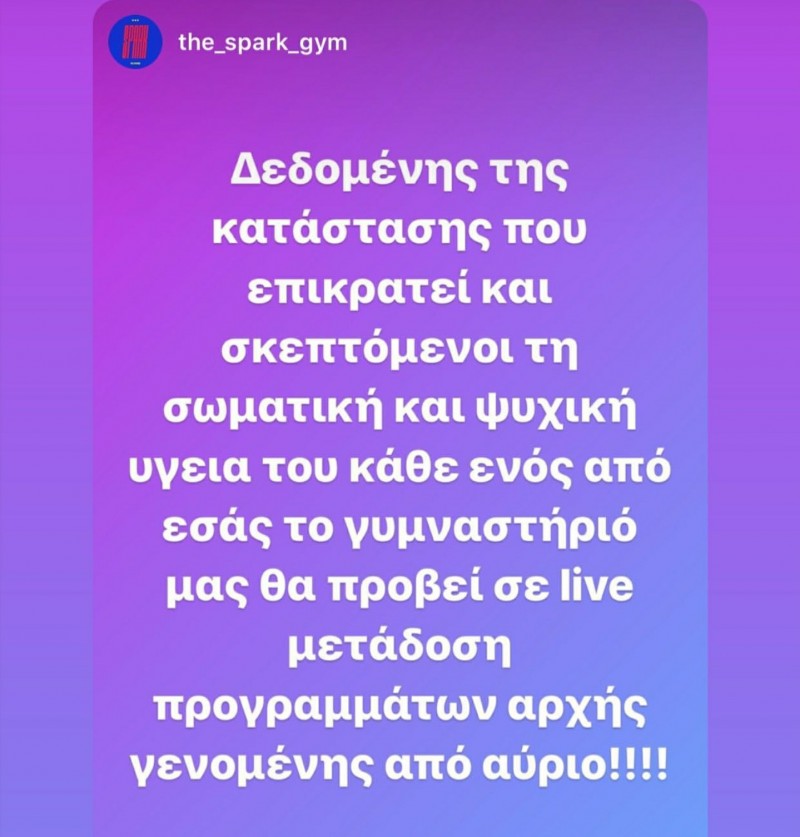 Γυμναστήριο SPARK – Live μετάδοση προγραμμάτων γυμναστικής Ανακοινώσεις Από admin Δημοσίευση Μαρ 22, 2020 -20:43 0 1.604 Κοινοποίηση FacebookTwitterΗλεκτρονικό ΤαχυδρομείοViber Το Γυμναστήριο SPARK της πόλης μας, φροντίζοντας την σωματική και ψυχική υγεία όλων μας προχωρά σε ζωντανή μετάδοση προγραμμάτων γυμναστικής από αύριο Δευτέρα. H σχετική ανακοίνωση – πρόγραμμα: Γυμναστήριο SPARK 0 1.604 Κοινοποίηση