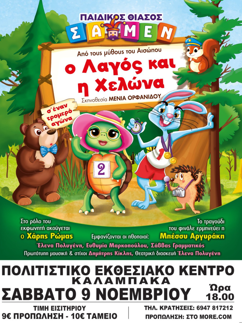 Ο παιδικός θίασος ΣΑΜΕΝ του Σάββα Γραμμάτικα ξεκίνησε και φέτος την περιοδεία του κι επισκέπτεται με μεγάλη χαρά την Καλαμπάκα, το Σάββατο 9 Νοεμβρίου στο Πολιτιστικό Εκθεσιακό Κέντρο με την sold out παιδική παράσταση “Ο λαγός και η χελώνα από τους μύθους του Αισώπου σε θεατρική διασκευή της Έλενας Πολυγένη και σκηνοθεσία της Μένιας Ορφανίδου.