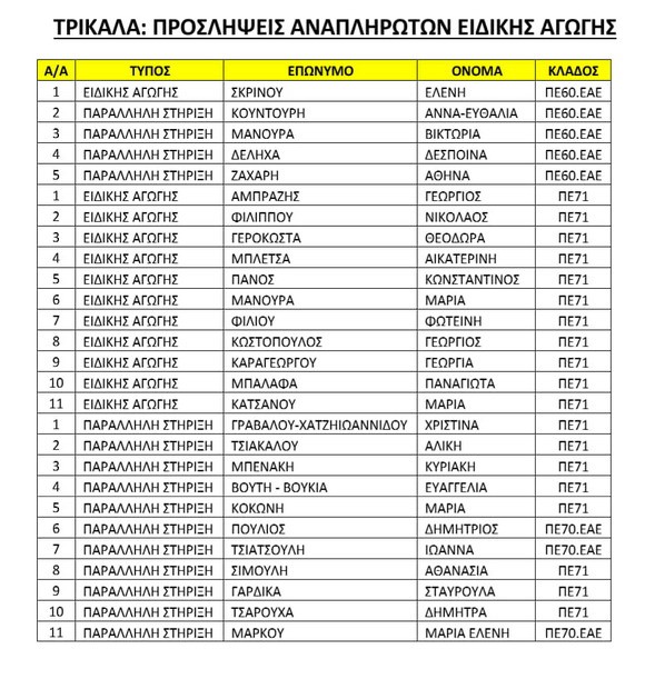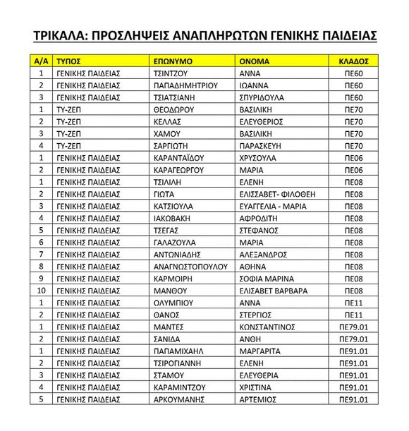Από το Υπουργείο Παιδείας και Θρησκευμάτων ανακοινώνεται ότι για το διδακτικό έτος 2019-2020, προσλαμβάνονται στα Τρίκαλα 57 αναπληρωτές εκπαιδευτικοί στην Πρωτοβάθμια Ειδική Αγωγή και Εκπαίδευση και Γενική Εκπαίδευση ως προσωρινοί αναπληρωτές.