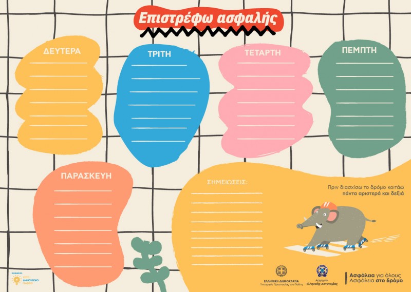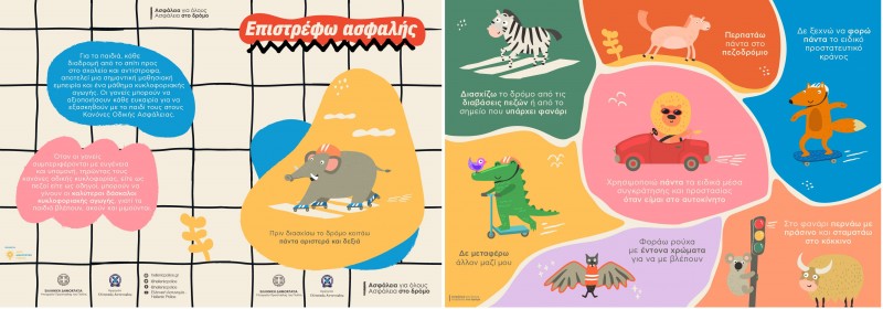 Μέσα από ποικιλία χρωμάτων και όμορφα σχέδια ζώων σε οχήματα και διαβάσεις, μεταδίδονται με διασκεδαστικό και ευρηματικό τρόπο οδηγίες προς τους μαθητές ώστε να κυκλοφορούν στο δρόμο με ασφάλεια.