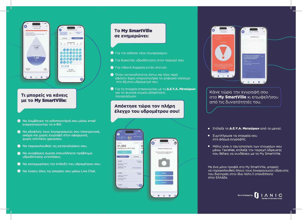 Μέσω του My SmartVille, η Δ.Ε.Υ.Α. Μετεώρων προσφέρει στον καταναλωτή όχι μόνο ένα καινοτόμο εργαλείο για τον έλεγχο του υδρομέτρου του, αλλά δημιουργεί, ουσιαστικά, ένα σύγχρονο κανάλι άμεσης επικοινωνίας και τον εμπλέκει ενεργά στη βελτιστοποίηση των παρεχόμενων υπηρεσιών. Περισσότερες πληροφορίες μπορείτε να βρείτε στο my.smartville.gr.