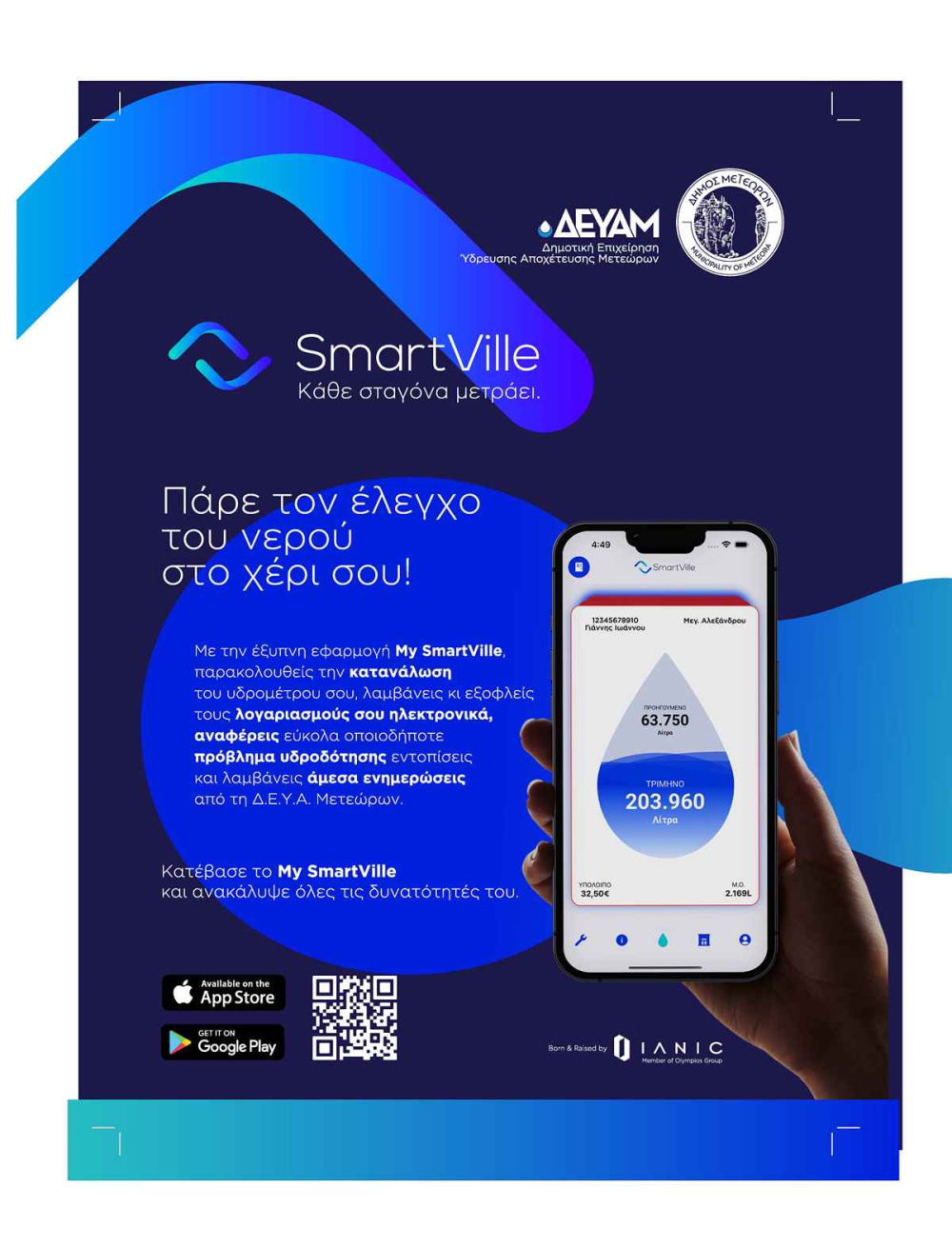 Η Δημοτική Επιχείρηση Ύδρευσης – Αποχέτευσης Μετεώρων, κάνει ένα μεγάλο βήμα προς την ψηφιοποίηση των λειτουργιών της, παρέχοντας δωρεάν στους καταναλωτές της το My SmartVille, την έξυπνη εφαρμογή που ενημερώνει τον πολίτη για τις καταναλώσεις του υδρομέτρου του και προσφέρει e-Bill, αυτοματοποιημένες υπηρεσίες και νέους τρόπους επικοινωνίας με τη Δ.Ε.Υ.Α.Μ. Πρόκειται για ένα σύγχρονο και εύχρηστο τρόπο διαχείρισης των λογαριασμών ύδρευσης και της κατανάλωσης του νερού.