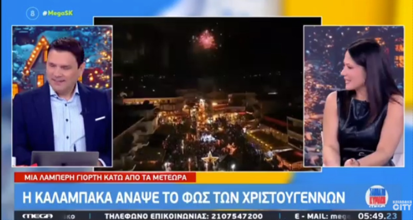 Στο επίκεντρο της τηλεοπτικής προβολής βρέθηκε η Καλαμπάκα, καθώς η τελετή φωταγώγησης του χριστουγεννιάτικου δέντρου της πόλης προβλήθηκε από μεγάλα τηλεοπτικά δίκτυα. Η πρωινή εκπομπή του Σαββατοκύριακου «Mega Σαββατοκύριακο», η οποία σημειώνει την υψηλότερη τηλεθέαση στη ζώνη της, αφιέρωσε ιδιαίτερο χρόνο στο γεγονός.