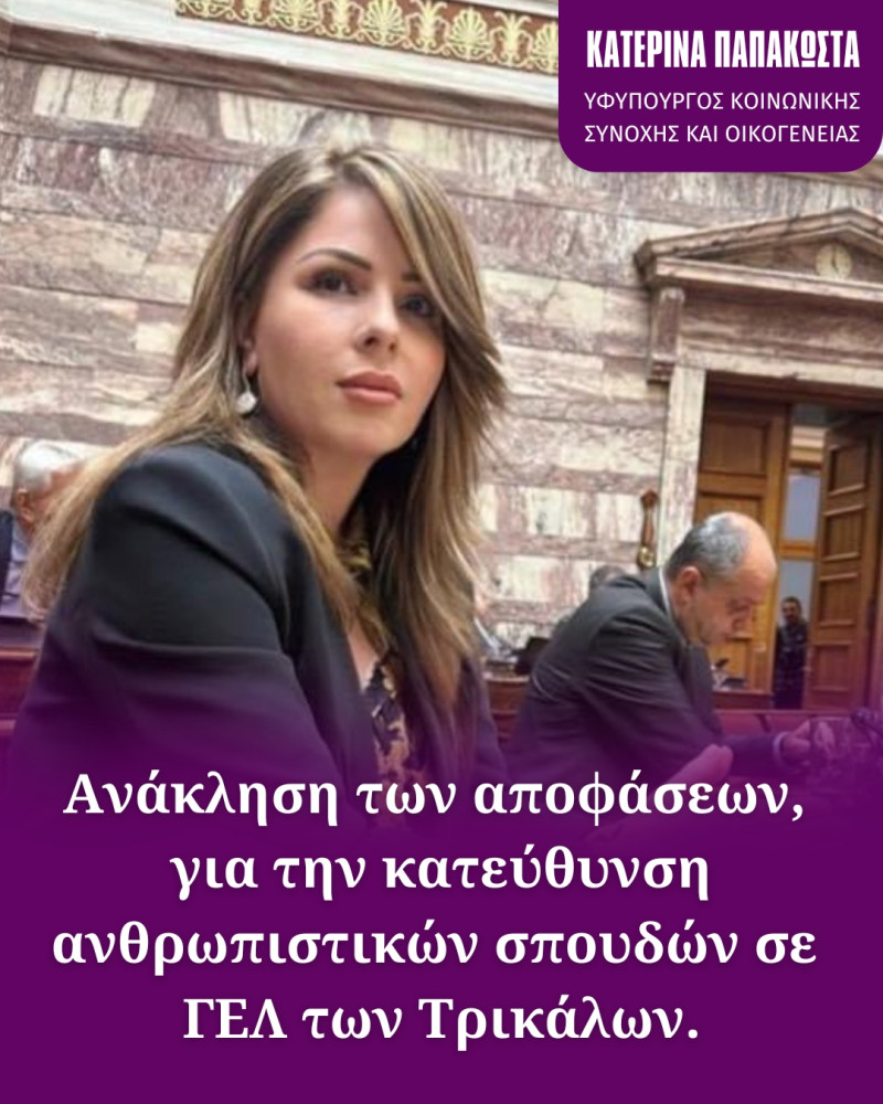 Η υφυπουργός Κοινωνικής Συνοχής και Οικογένειας, Κατερίνα Παπακώστα – Παλιούρα ευχαριστεί θερμά το Υπουργείο Παιδείας για τις άμεσες ενέργειές του και την ανταπόκριση σε σχετικό αίτημα που εξέφρασε, σχετικά με την ανάκληση της απόφασης για μη έγκριση της ομάδας προσανατολισμού ανθρωπιστικών σπουδών στη Γ’ Λυκείου του 2ου, του 6ου ΓΕΛ Τρικάλων & του ΓΕΛ Οιχαλίας. Η απόφαση του Υπουργείου να διορθώσει και να ανακαλέσει την προηγούμενη απόφασή του, διασφαλίζει ότι οι μαθητές στα Τρίκαλα θα συνεχίσουν να έχουν πρόσβαση σε ολοκληρωμένη εκπαίδευση, διατηρώντας την ακαδημαϊκή ποικιλομορφία και τις ίσες ευκαιρίες για όλους τους μαθητές.