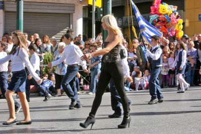 Τα βλέμματα όλων όσων βρέθηκαν στη μαθητική παρέλαση έκλεψε η «ξανθομαλλούσα» δασκάλα που συνόδευε τους μαθητές στην εκδήλωση.