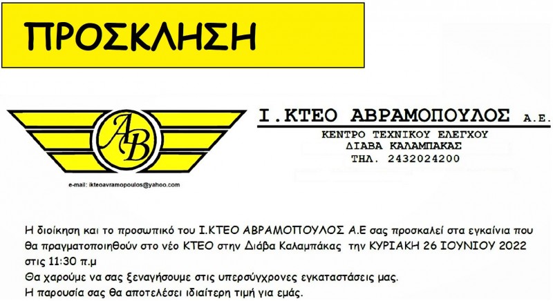 Η διοίκηση και το προσωπικό του Ι.ΚΤΕΟ ΑΒΡΑΜΟΠΟΥΛΟΣ Α.Ε. σας προσκαλεί στα εγκαίνια που θα πραγματοποιηθούν στο νέο ΚΤΕΟ στην Διάβα Καλαμπάκας την ΚΥΡΙΑΚΗ 26 ΙΟΥΝΙΟΥ 2022 στις 11:30 π.μ