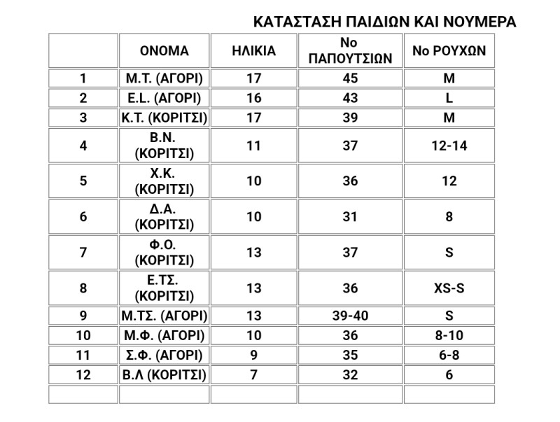 Έχουμε ενημερωθεί ότι υπάρχει άμεση ανάγκη για ρούχα και παπούτσια αγοριών και κοριτσιών για ηλικίες από Ε’ Δημοτικού έως Γ’ Λυκείου.