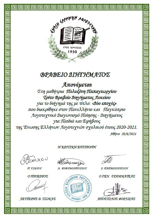 Η Πολυξένη Παπαγεωργίου, του Κων/νου και της Μαρίας, μαθήτρια της Γ΄Λυκείου, του ΓΕΛ Καλαμπάκας με το διήγημα «Δύο εποχές» έλαβε το τρίτο βραβείο στον ΠΑΝΕΛΛΗΝΙΟ και Παγκύπριο Λογοτεχνικό Διαγωνισμό Ποίησης και Διηγήματος που προκηρύχθηκε για το έτος 2020-2021, από την ΕΝΩΣΗ ΕΛΛΗΝΩΝ ΛΟΓΟΤΕΧΝΩΝ για Παιδιά και Εφήβους και είχε θέμα: «1821-2021: Διακόσια χρόνια από την Ελληνική Επανάσταση του 1821.