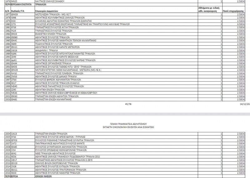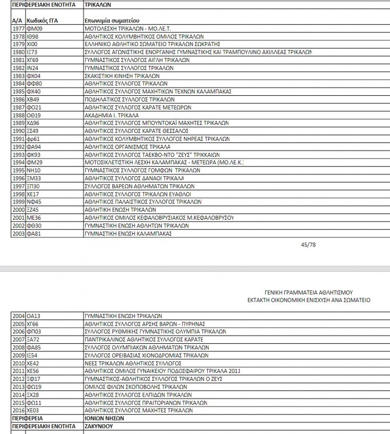 Τα σωματεία του Ν. Τρικάλων που δεχονται ενίσχυση είναι τα παρακάτω: