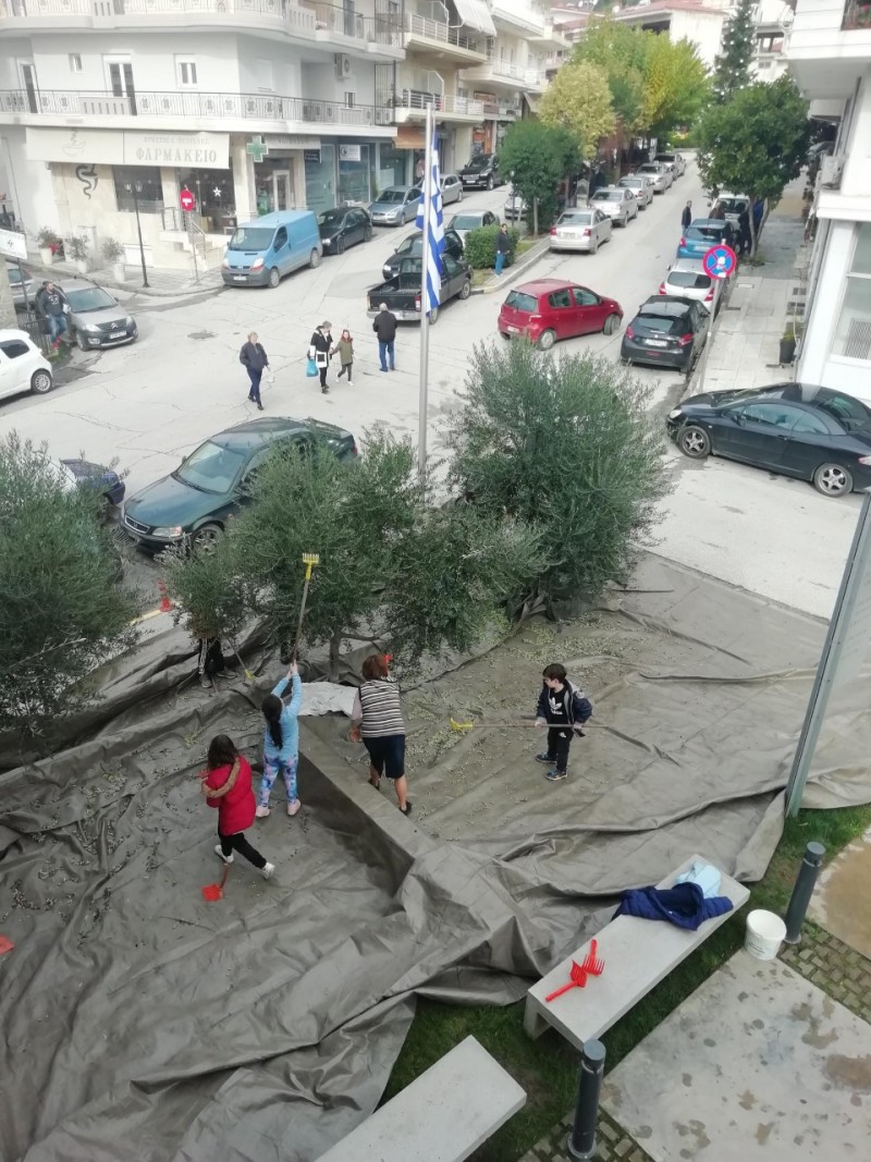 Με ενθουσιασμό και ομαδικό πνεύμα, τα παιδιά χωρίστηκαν σε ομάδες, άπλωσαν τα πανιά και άρχισαν να «χτενίζουν» τα κλαδιά για να πέσουν οι ελιές.