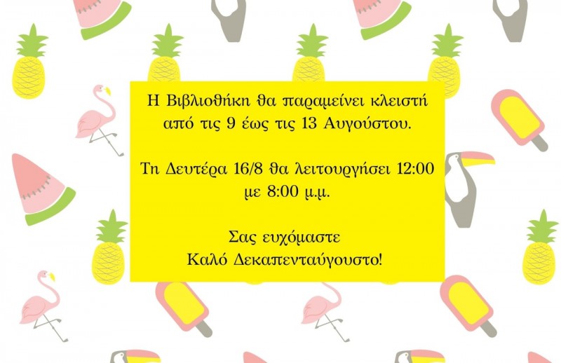 Από Δευτέρα 9 έως Παρασκευή 13 Αυγούστου η Βιβλιοθήκη θα παραμείνει κλειστή. Ανοίγει ξανά Δευτέρα 16 Αυγούστου από τις 12:00 μέχρι τις 8:00 μ.μ..
