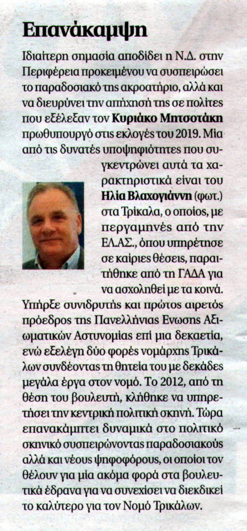 «Ο Ηλίας Βλαχογιάννης με την εντυπωσιακή του διαδρομή στην Ελληνική Αστυνομία, στη Νομαρχιακή Αυτοδιοίκηση και στο Κοινοβούλιο, αποτελεί μία δυνατή υποψηφιότητα για να προσεγγίσει η Παράταξη της Νέας Δημοκρατίας τόσο τους παραδοσιακούς της ψηφοφόρους ,όσο και νέους που επιζητούν πρόσωπα με κύρος, έργο και ακεραιότητα» ,αναφέρει μεταξύ άλλων το σχόλιο της εφημερίδας, αφού κάνει αναφορά στο σπουδαίο έργο του στη Νομαρχιακή Αυτοδιοίκηση και την πορεία του ως Πρόεδρος και ιδρυτής της Πανελλήνιας Ομοσπονδίας Αξιωματικών Αστυνομίας .